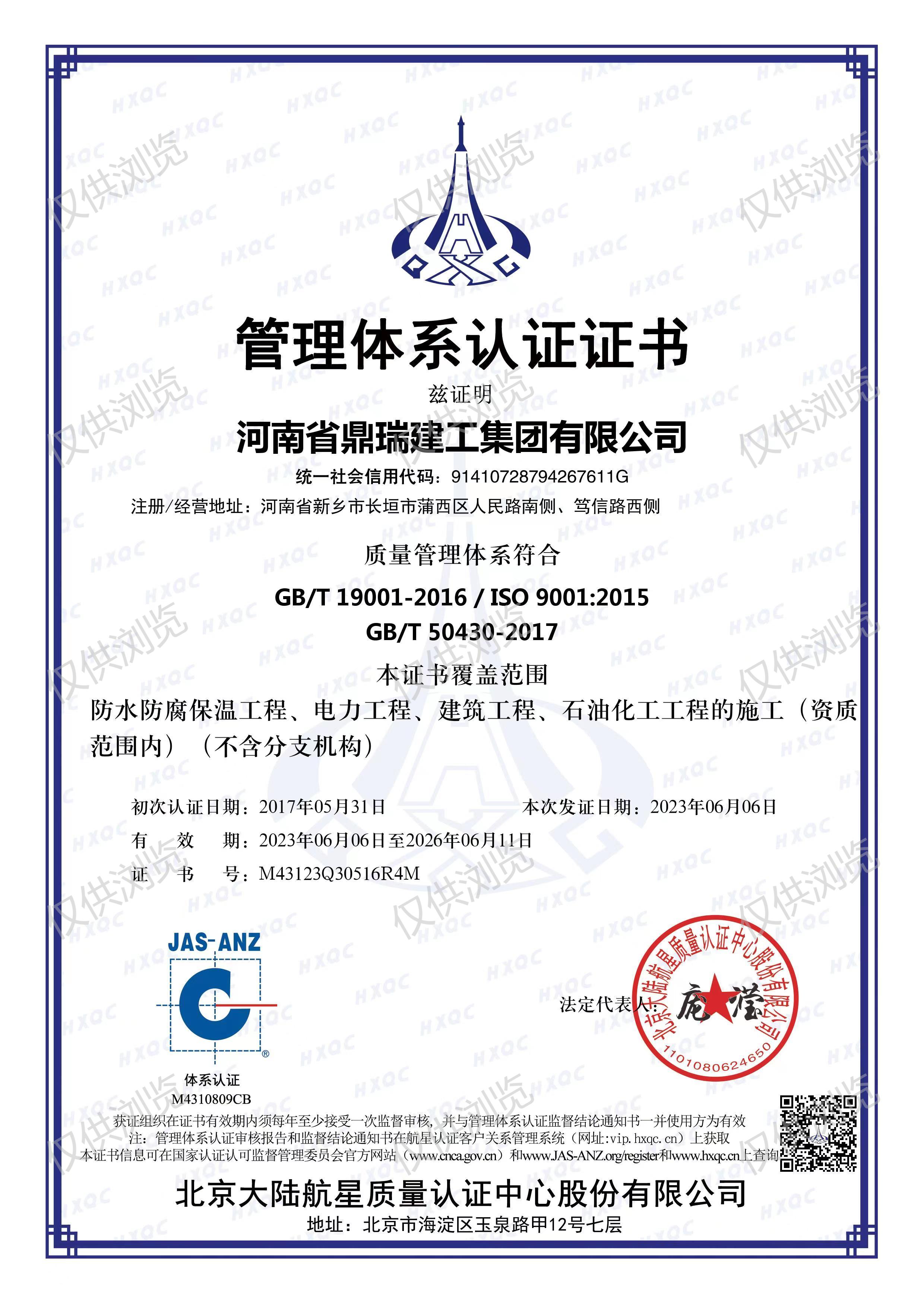 質量管理體系認證證書